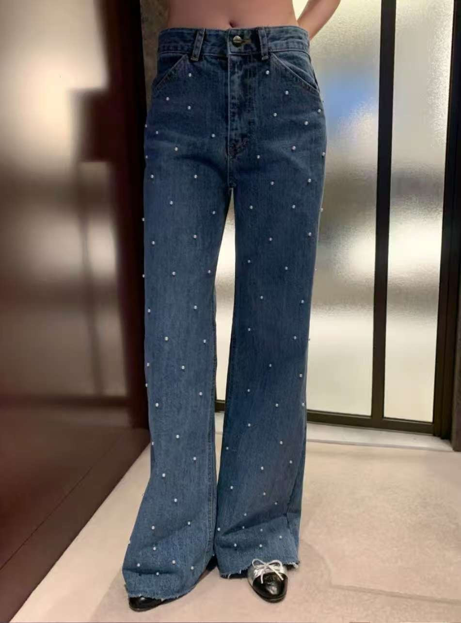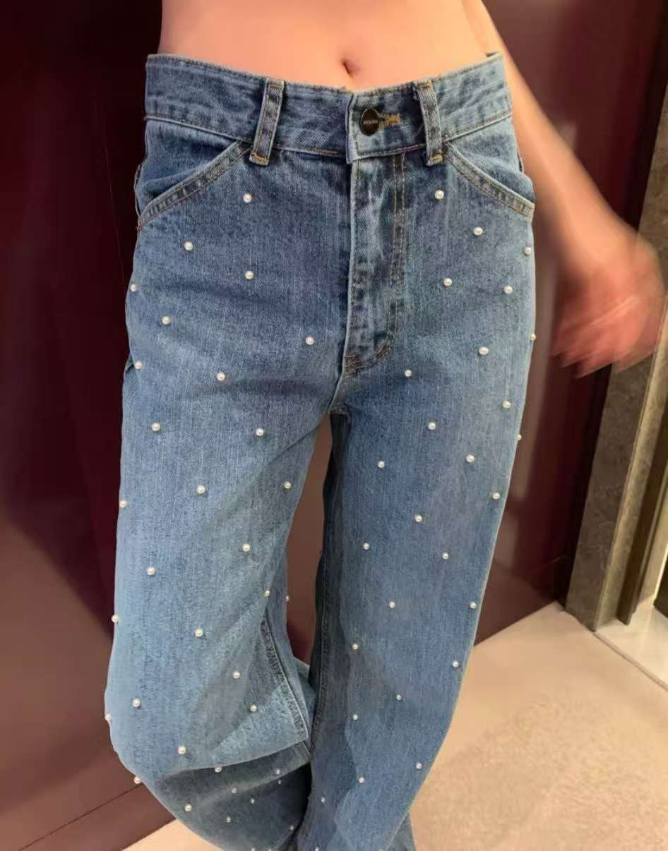 珍珠牛仔褲,高腰直筒牛仔褲,星點牛仔褲,顯瘦丹寧,時尚牛仔褲,珍珠裝飾褲,女裝牛仔褲