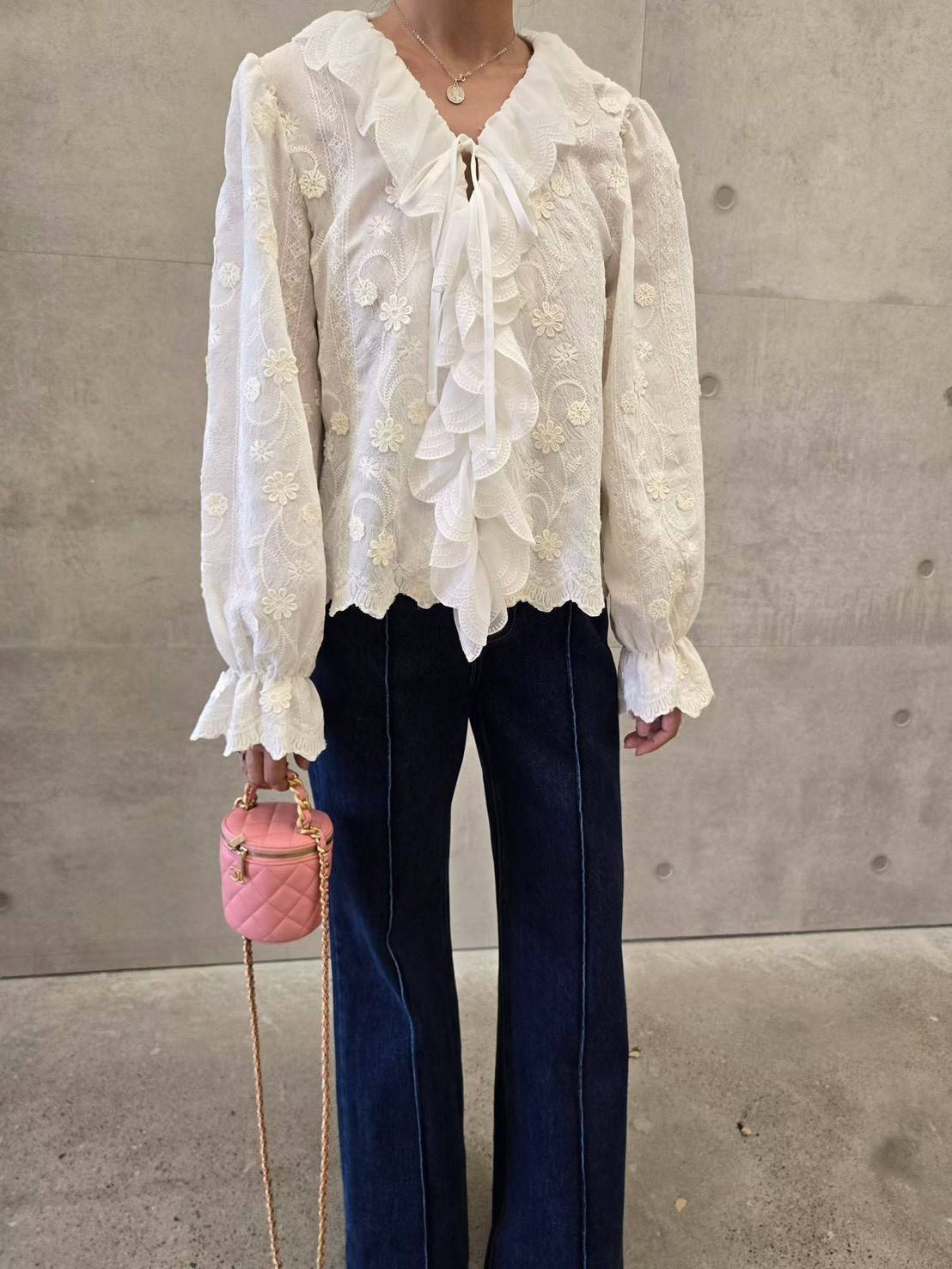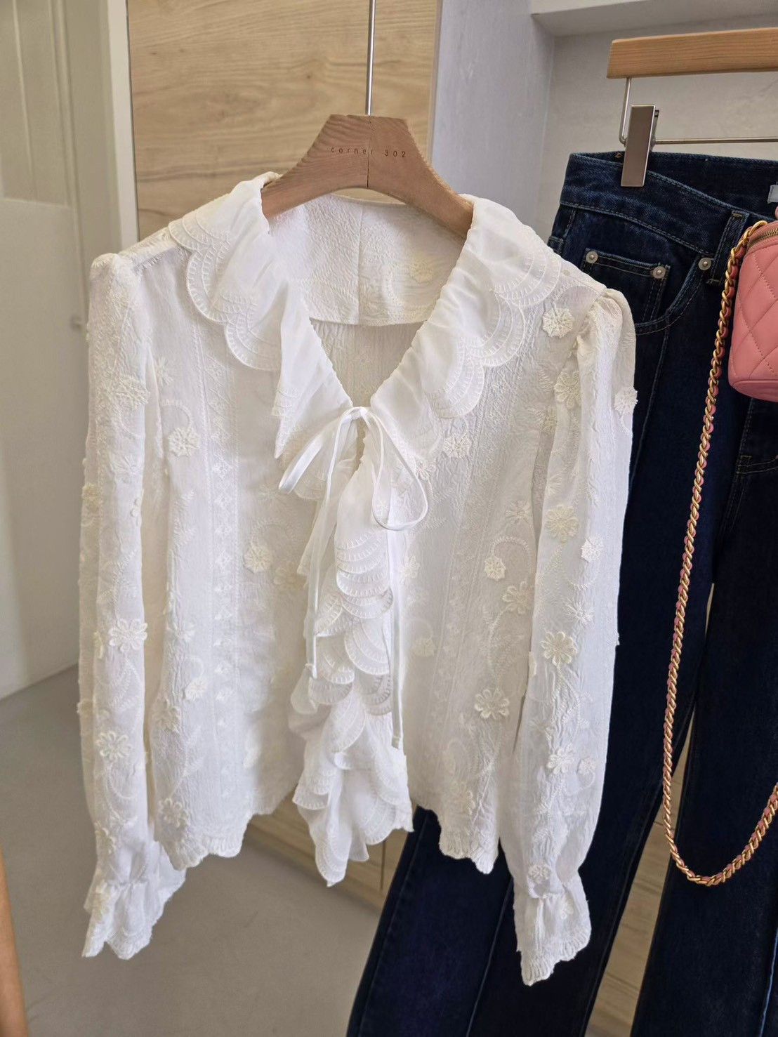 韓系上衣,荷葉上衣,蕾絲襯衫,立體花刺繡上衣,浪漫上衣,氣質上衣,韓國女裝,秋冬新款上衣,通勤穿搭